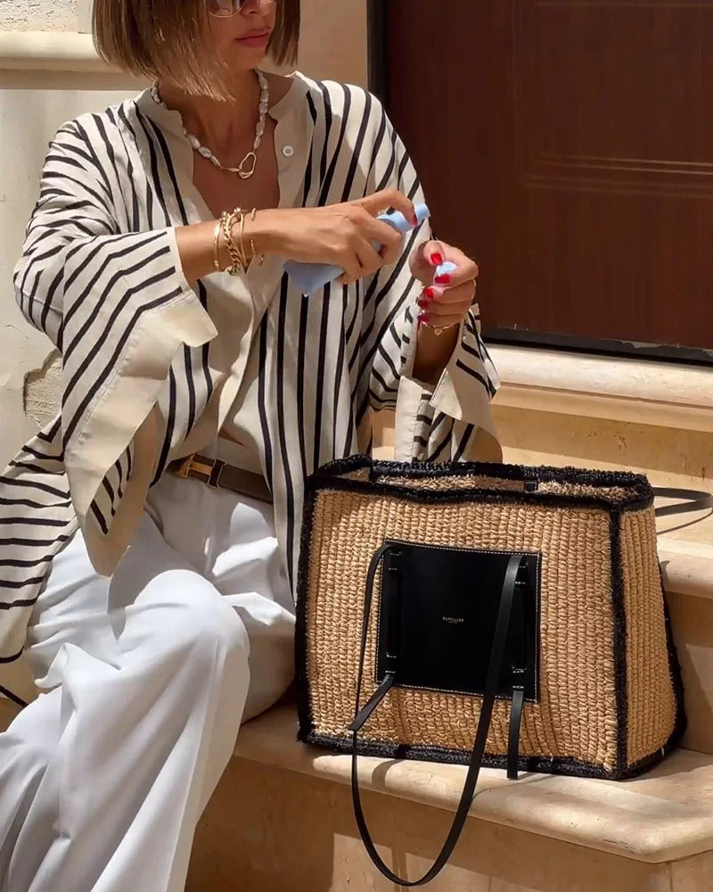 The Fhaye Striped Flowy Blouse is the perfect blend of sophistication and ease. With its draped silhouette, deep V-neckline, and striking striped pattern, this blouse adds a modern edge to any look. Whether styled with tailored trousers for a polished vibe or paired with denim for casual outings, it’s a versatile piece that elevates your wardrobe.